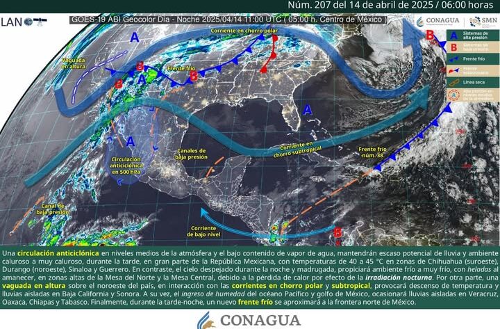 La Comisión Estatal del Agua (Ceagua) informa la perspectiva meteorológica para Morelos durante la semana del 14 al 17 de abril, en la que el estado experimentará condiciones mayormente estables y secas, producto de un sistema anticiclónico que dominará los niveles medios de la atmósfera.